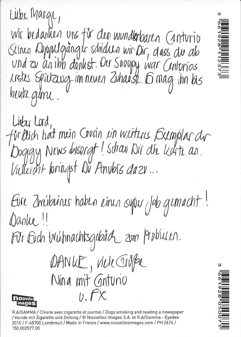 Ein herzliches DANKESCHÖN und ganz viele leuchtende Augen & schnuppernde Nasen & Weihnachtsfreude an Nina, FX & Centurio }:o)